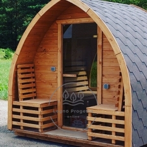 Sauna Igloo 4 m. con spogliatoio chiuso e panchine esterne, riscaldatore da scegliere a parte.