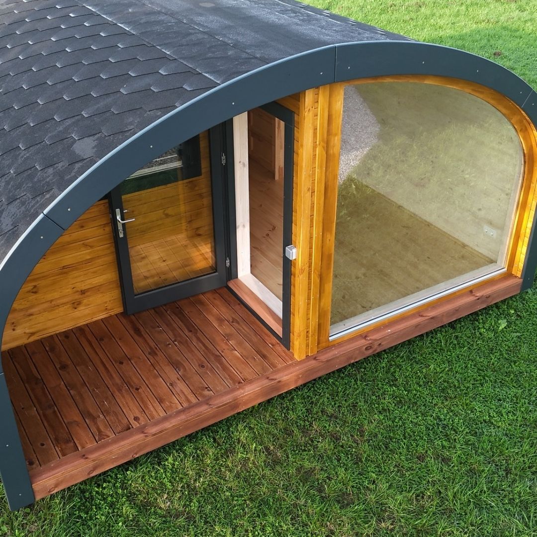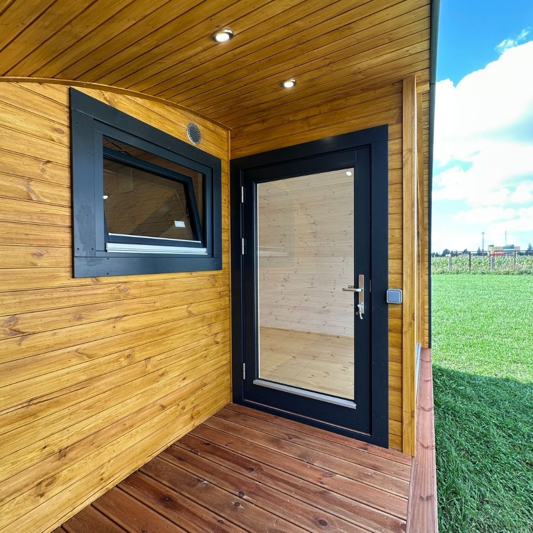 Realizzato in legno coibentato, il Pod Lux garantisce un eccellente isolamento termico e acustico, rendendolo ideale per l’utilizzo durante tutto l’anno. Il tetto è rivestito con tegole bituminose ad alta resistenza, mentre le finestre e la porta sono verniciate in elegante colore Antracite, per un design contemporaneo perfettamente integrato nell’ambiente naturale. La struttura include una terrazza coperta in legno impregnato, uno spazio perfetto per rilassarsi, prendere il sole o godere della vista esterna.