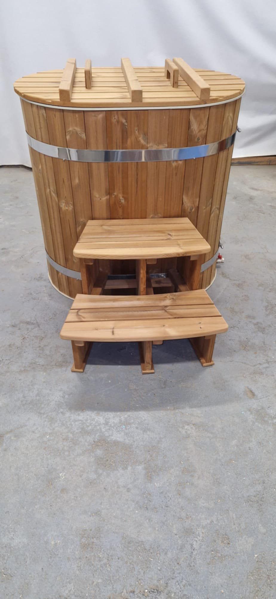Accessori inclusi: due gradini esterni in legno, due fasce regolabili in acciaio inox, scarico inferiore dell’acqua